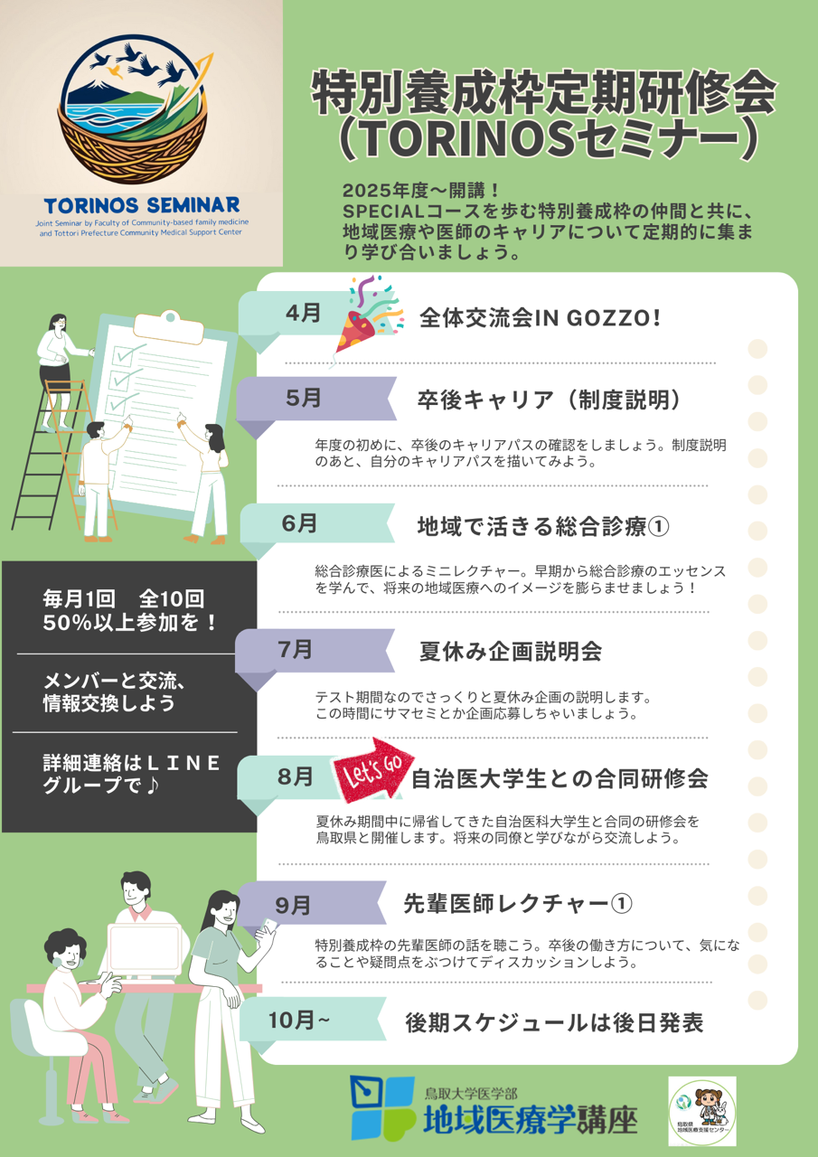 今年度より、新たに特別養成枠学生を対象とした「TORINOSセミナー」を、地域医療学講座と鳥取県地域医療支援センターの共催で開始しました。本セミナーは、地域枠学生としてのキャリア形成や総合診療に関する理解を深めることを目的としています。