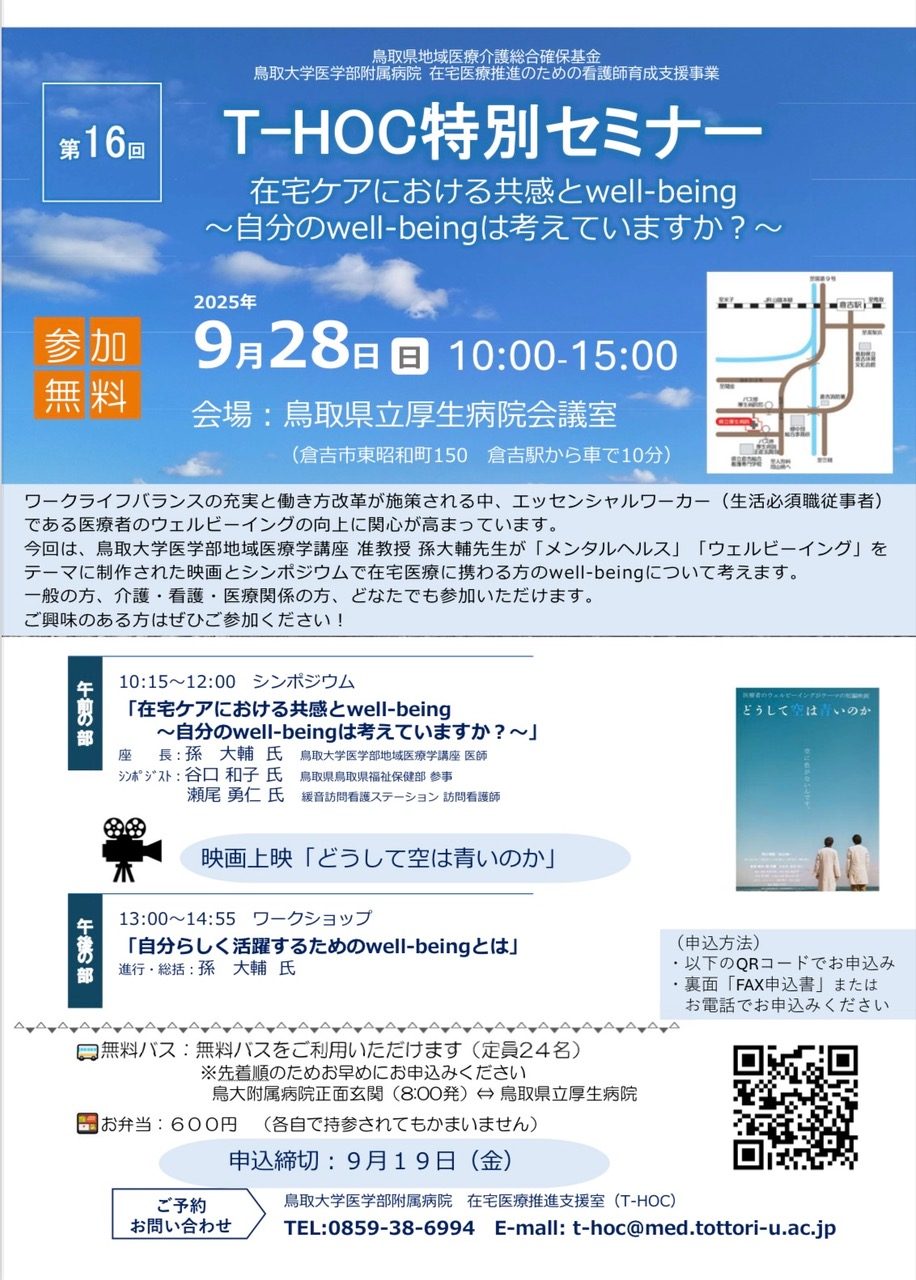 9月28日、倉吉市の鳥取県立厚生病院で開催された第16回T-HOC特別セミナーにて、講師を務めました。今回のテーマは「在宅ケアにおける共感とwell-being~自分のwell-beingは考えていますか?~」。午前中はシンポジウムとして、私を含むシンポジストがそれぞれの立場から在宅ケアにおける共感の意義と難しさ、そして医療者自身のwell-beingをどう守るかについて発表しました。