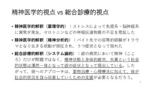 一方で、総合診療・家庭医療の立場からは、「心の問題」を単に脳や精神の異常としてではなく、身体的・心理的・社会的要因の相互作用として捉える視点(生物―心理―社会モデル)を紹介しました。ドラマ『19番目のカルテ』の一場面も題材に取り上げ、学生たちとともに「患者の苦しみをどう理解するか」「医療がどのように人を包み込むか」を対話的に考えました。