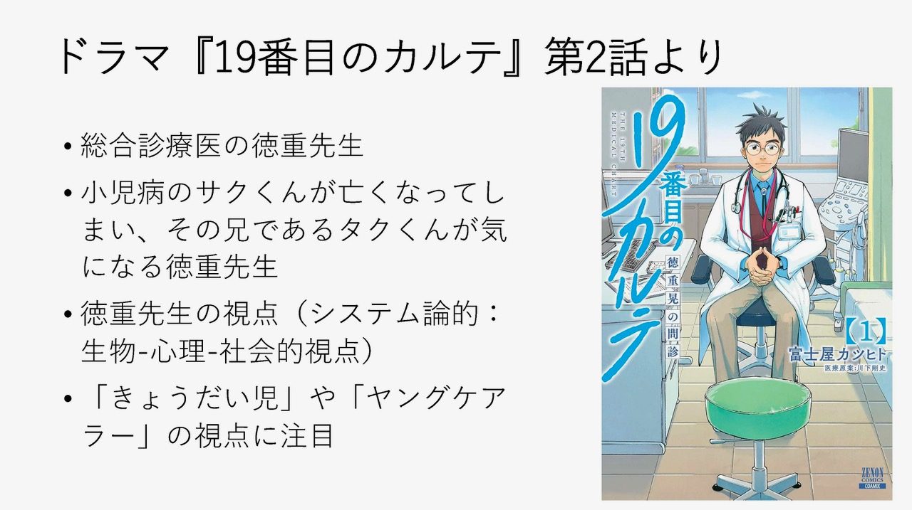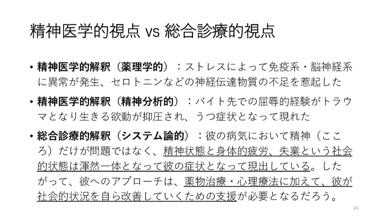 一方で、総合診療・家庭医療の立場からは、「心の問題」を単に脳や精神の異常としてではなく、身体的・心理的・社会的要因の相互作用として捉える視点(生物―心理―社会モデル)を紹介しました。ドラマ『19番目のカルテ』の一場面も題材に取り上げ、学生たちとともに「患者の苦しみをどう理解するか」「医療がどのように人を包み込むか」を対話的に考えました。