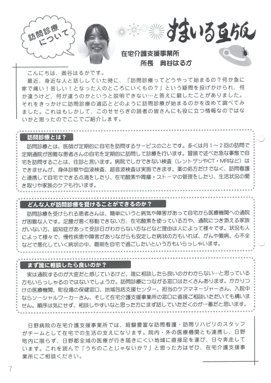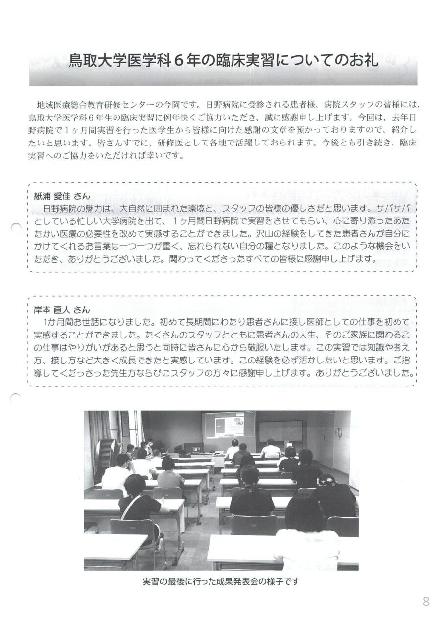 412月 2025 日野病院組合だより『せせらぎ』に掲載されました 日野病院組合だより『せせらぎ』No.84に、奥谷先生の訪問診療についてと臨床実習のお礼が掲載されました。 BY tottori-idai-main 0