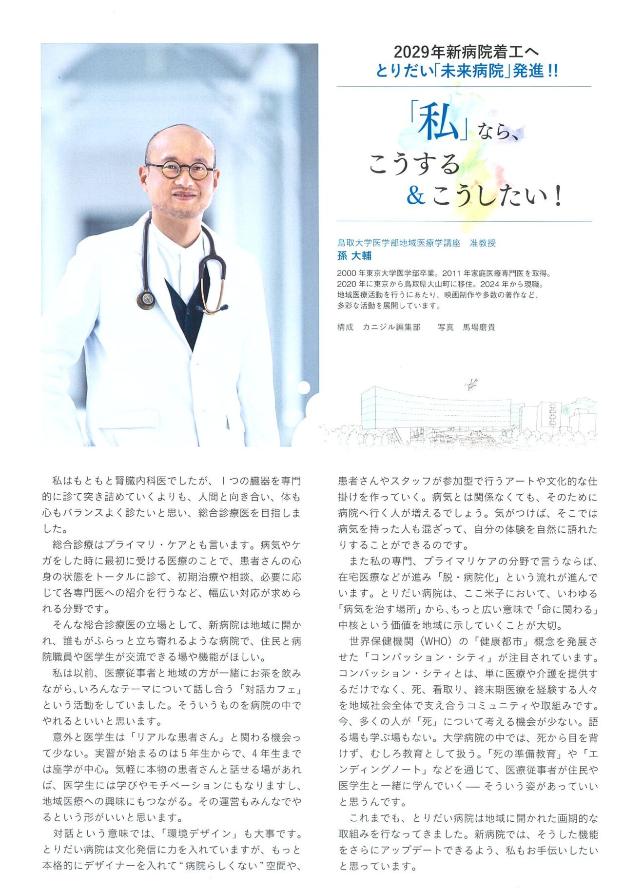 512月 2025 広報誌『カニジル』に掲載されました 鳥取大学医学部附属病院 広報誌『カニジル』第20号に孫先生の記事が掲載されました。 2029年新病院着工へ とりだい「未来病院」発進‼ 「私」なら、こうする&こうしたい! BY tottori-idai-main 0