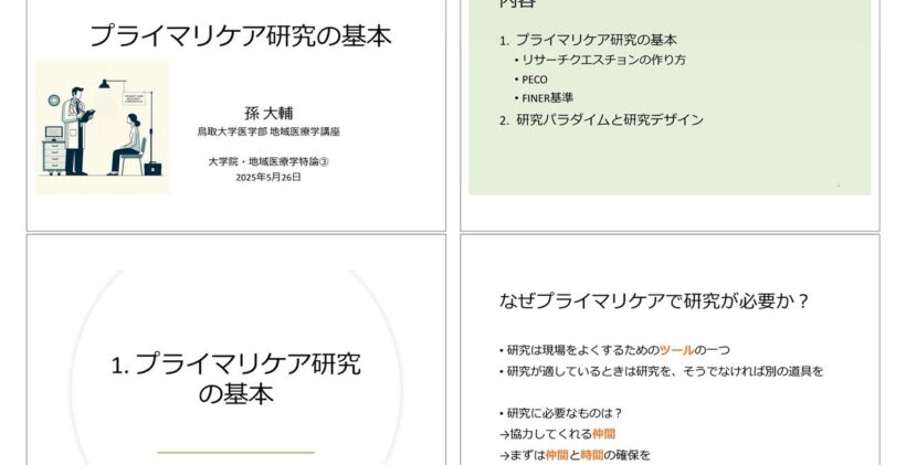 2025年度、5/12〜6/30に鳥取大学大学院において「地域医療学特論・演習」を開講しました。本シリーズは、地域医療を単なる医療提供にとどまらず、保健・医療・福祉を包括し、高齢化社会においても機能する仕組みとして学ぶこ…