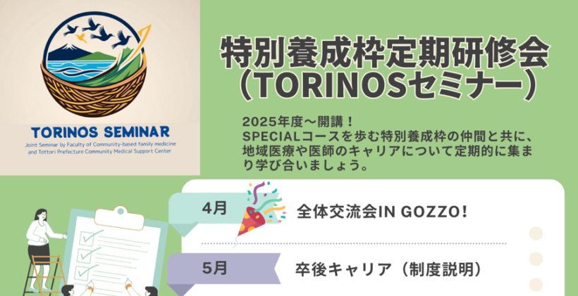 今年度より、新たに特別養成枠学生を対象とした「TORINOSセミナー」を、地域医療学講座と鳥取県地域医療支援センターの共催で開始しました。本セミナーは、地域枠学生としてのキャリア形成や総合診療に関する理解を深めることを目…
